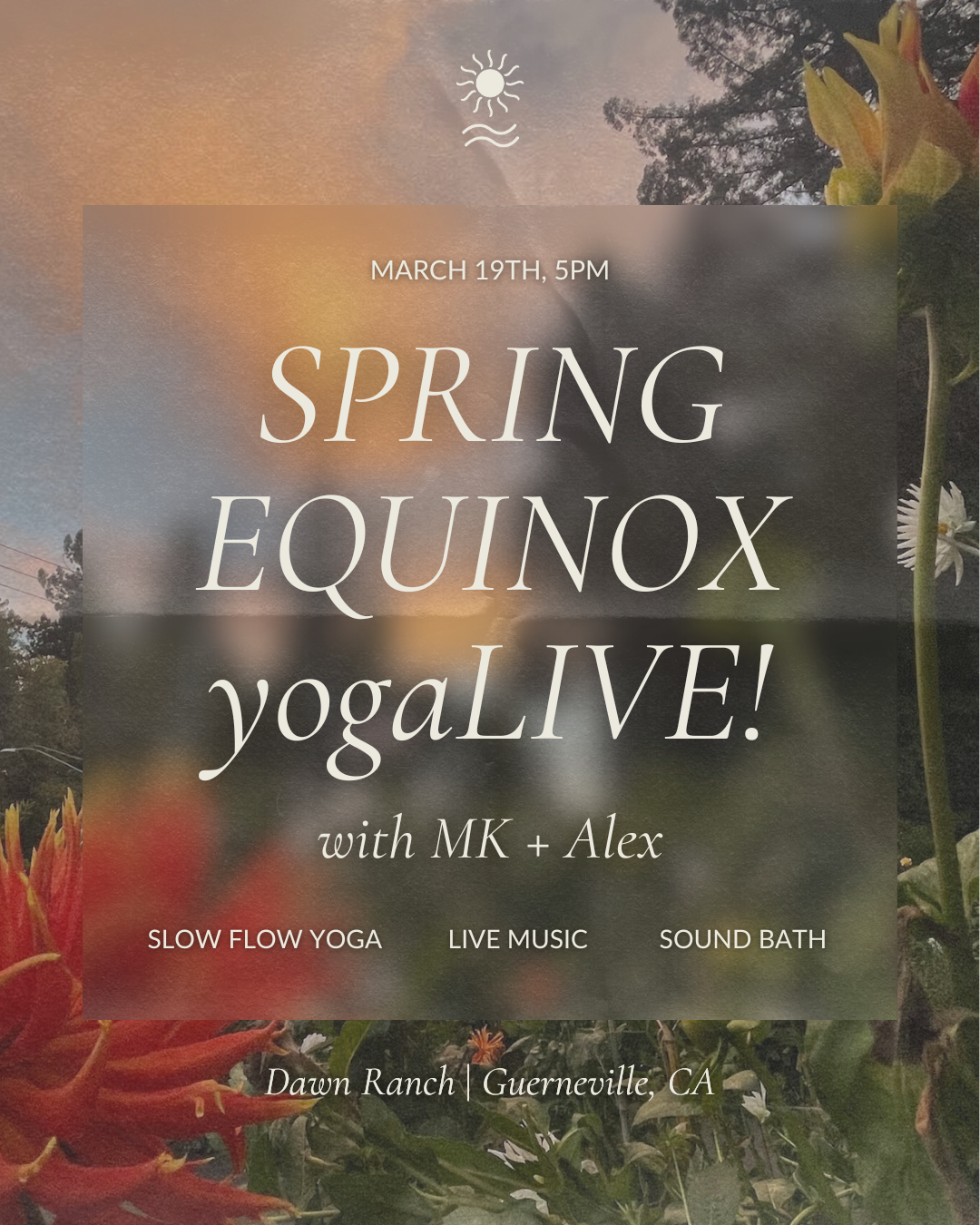 Join Sol Rio Co-Founders MK & Alex in a special 75 minute all-levels yoga session set to live music, welcoming the Spring Equinox. MK will guide you in an accessible slow-flow practice, rooted in breath. Alex will support your practice by playing a live soundscape created on the spot, using a variety of musical instruments. The session concludes with an ambient sound bath with both acoustic (gong, chimes, bowls, trumpet) and non-acoustic instruments (keyboard & synthesizer), immersing participants in healing sound waves.